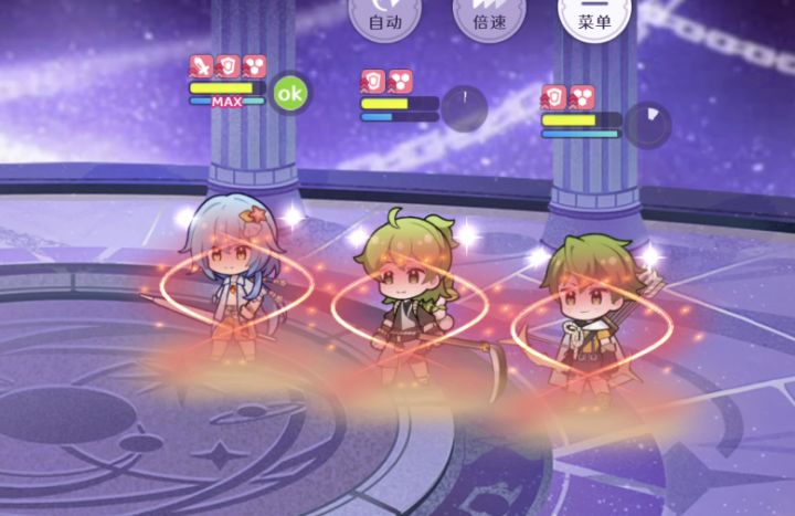 核心机制是,皮特先放大,降低boss攻击,这个技能真的算神技了,瞬间不疼了,然后茶太郎放大拉条,这个技能也很神啊,buff没结束的状态下,就可以再次放大了,同时还大幅加防御。之后就进入如图2状态,形成一个非常稳定的循环,只有连着吃boss的技和大,血量才会略微不健康,这时候茶太郎也可以回血,这个阵容生存问题基本解决,我带路亚的大基本没放过。这个阵容主要是缺输出,如果有好的装备站得住,可以把路亚换成其他物理输出,【因为我个人没有其他风属性输出,只能用他了】
