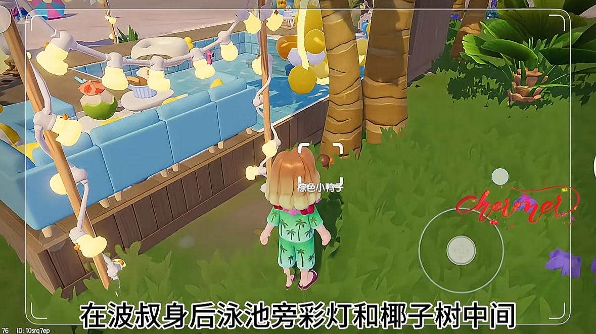 棕色鸭子拍照任务位置:在波叔身后泳池旁彩灯和椰子树中间