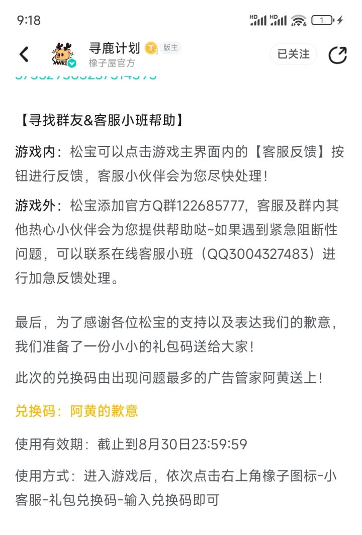 兑换码:阿黄的歉意(奖励为100橡子,建议输入时自己手打)