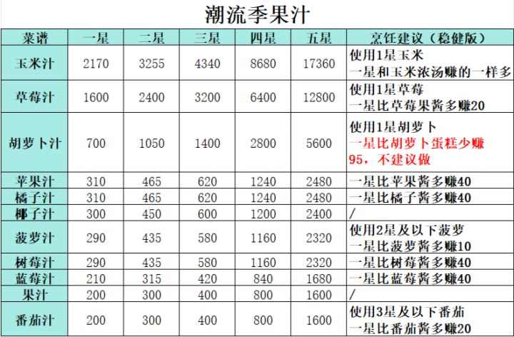 菠萝汁:使用2星及以下菠萝,一星比菠萝酱多赚10。