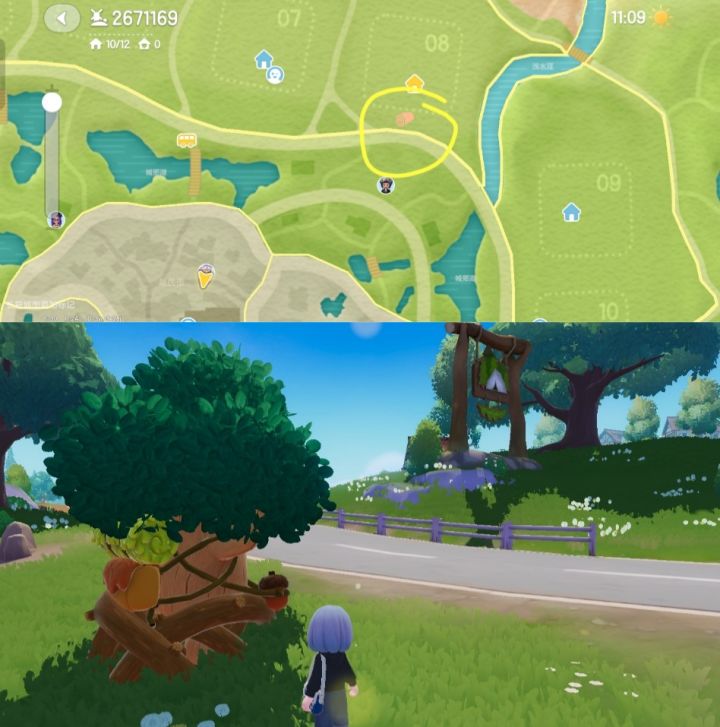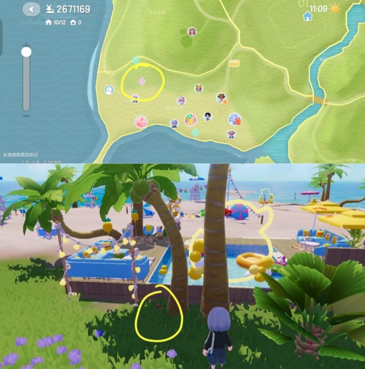 图一是棕色小鸭子的位置,在水池后面的草丛里