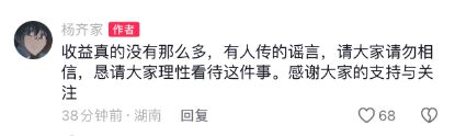 根据事后的数据统计,杨齐家直播《黑神话:悟空》期间收获了1700万音浪的礼物,折合人民币收益约为170万元。网友推测,扣除平台抽成他的收益应该也有85万元。不过,这则消息今日被本人辟谣了。