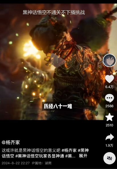 杨齐家的爆火固然存在一些偶然性,但作为一款现象级的爆款游戏,《黑神话:悟空》的发布也必然能够造就这样的案例。