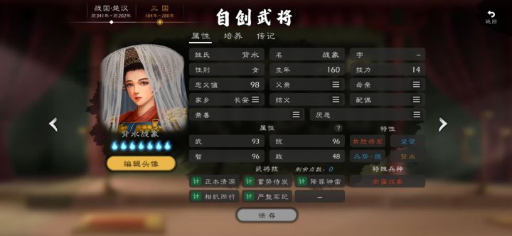 ②图一适用极限难度,思路是特性取尽量硬,技能除神雷外系取减对方攻击力和提自身士气。已实测,万人队未点天赋可反3K至4K5,不挨围可1V4或5。虎痴或者可换常胜,但常胜与沉稳冲突,未测,有兴趣者可自测。