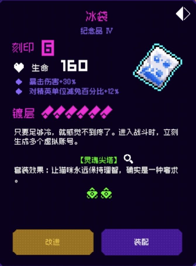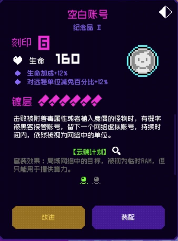 击杀获得虚拟账号,效果有点类似于毒二的空白账号,是非希尔角色使用套装灵魂尖塔的关键(不带这个就要带其他产生虚拟账号的纪念品)