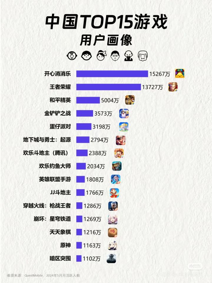 中国前15大游戏中,开心消消乐以1.53亿月活跃用户数居首, 其次是王者荣耀(1.37亿),和平精英(5004万)和金铲铲之战(3573万)。其他游戏如蛋仔派对、地下城与勇士:起源和欢乐斗地主等紧随其后。