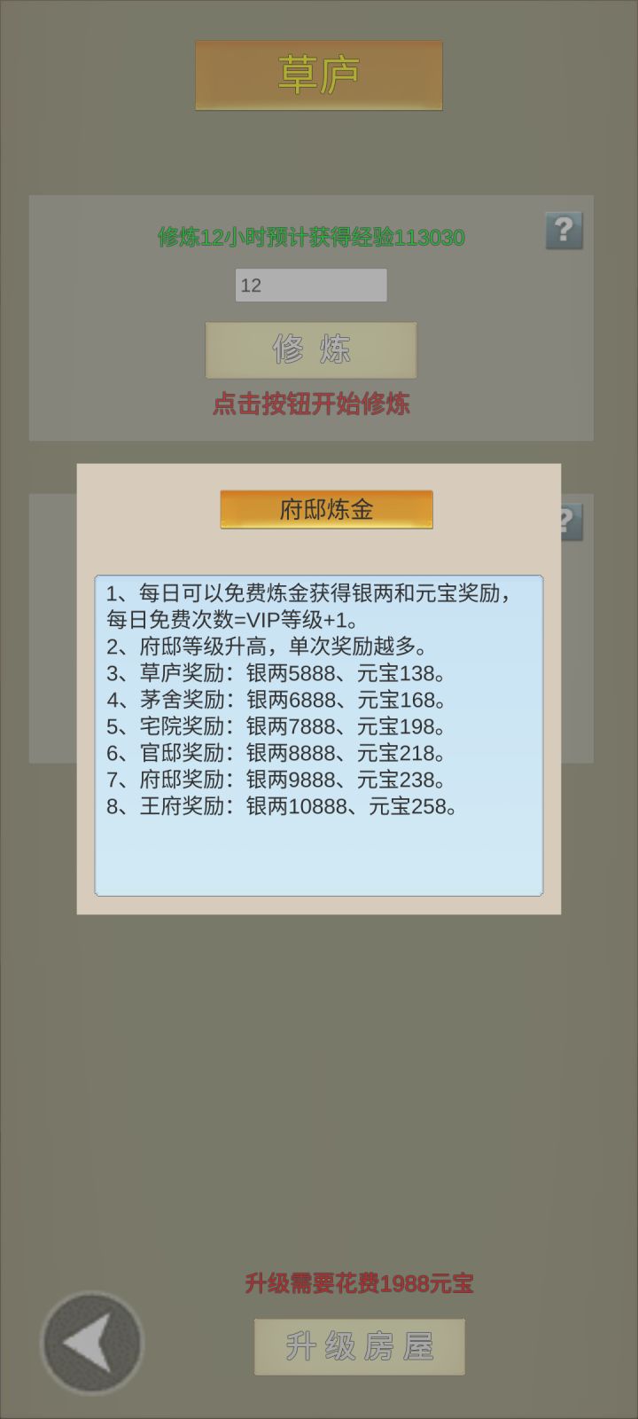 府邸的等级越高,奖励加成也多,元宝充足的玩家建议早点升级到最高级。