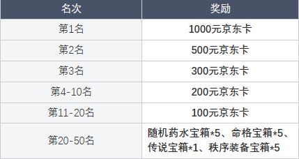 50元京东卡+秩序装备宝箱*3、随机药水宝箱*5、铭文碎片*100