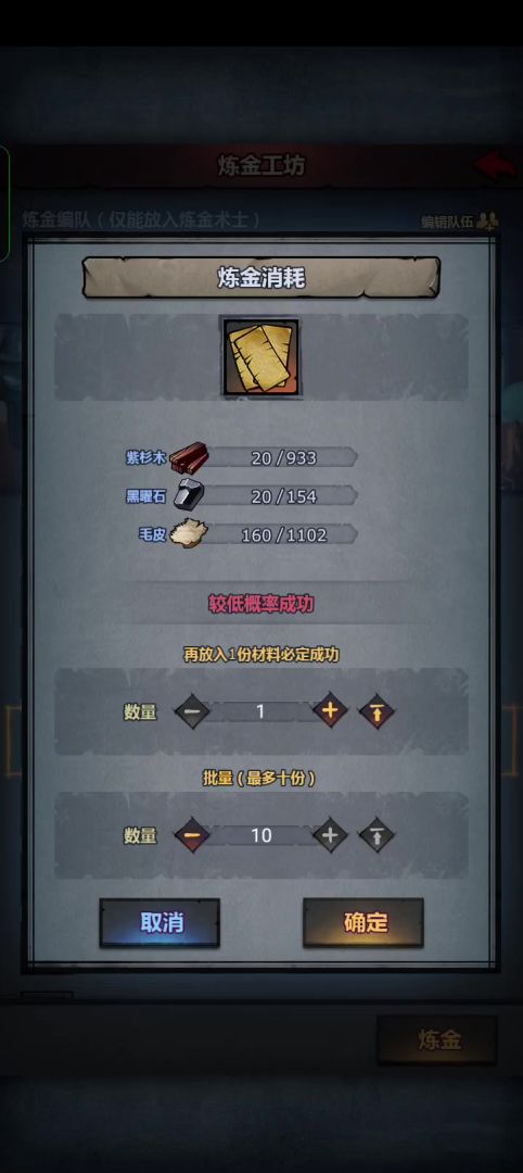 这里说明本人经过大量地合成测(感)得(觉)一份材料就成功的几率约为60%,练废会返还材料,大约练废两份再补一点材料又可以炼一次了