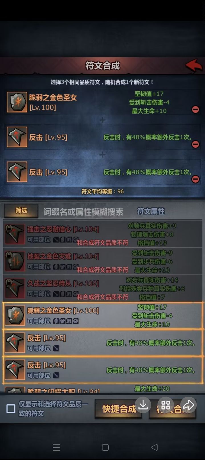 这里要说明的一点很简单,锁定符文时不要无脑堆等级,如果符文其它的第二,第三属性比较高(5点属性左右),我们锁属性时就尽量控制在相近等级,而不是急着合成更高等级。这样合出来的符文就是降低无用属性,提高有用属性了,同时不需要更高级的符文参与合成,这样就能减少成本