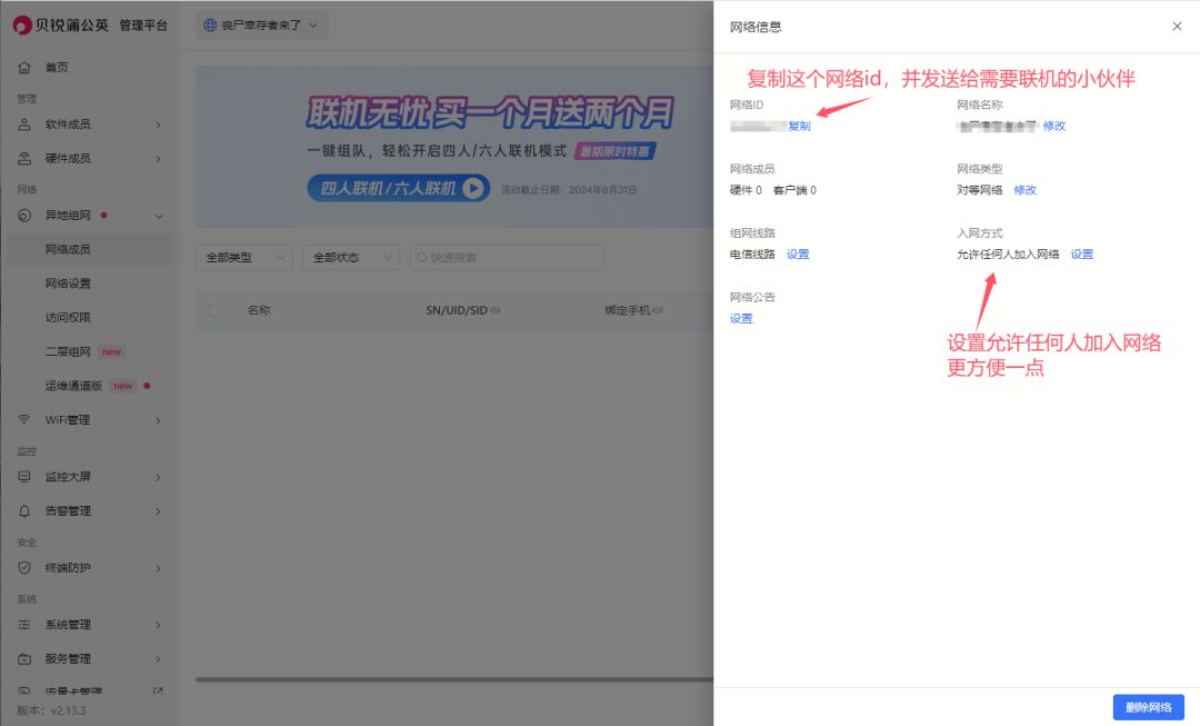 点击“网络信息”复制网络id(这个id就是你的网络,把“网络id:xxxxxxxxx”发送给需要联机的小伙伴,他们加入就可以在同一个网里了)