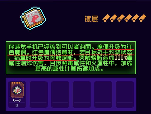 2.植入魔偶+身上有灼烧伤害,如果你身上有梅果派,也会触发漏洞,效果和捕梦扑克一样,只是多了一个前提的灼烧条件。