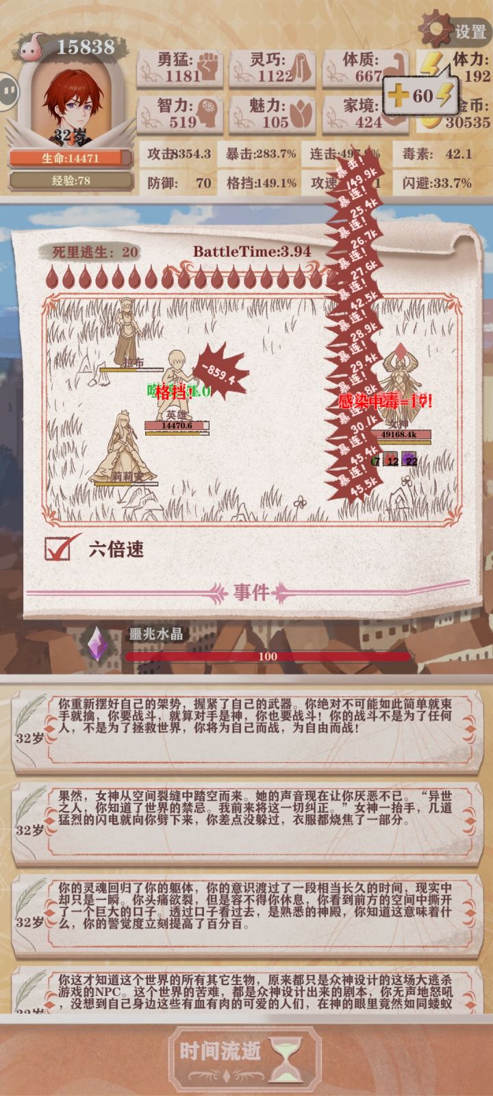 打女神前提是公主好感度刷满的同时进贡到出现世界线变动,然后打完大主教之后选择保守秘密再带走研究,过几轮32岁能看到女神。目前这个思路天赋应该算是刷的比较快的,刷怪都是一刀一个,不会像玩毒那样容易被召唤物和女神打暴毙。。。