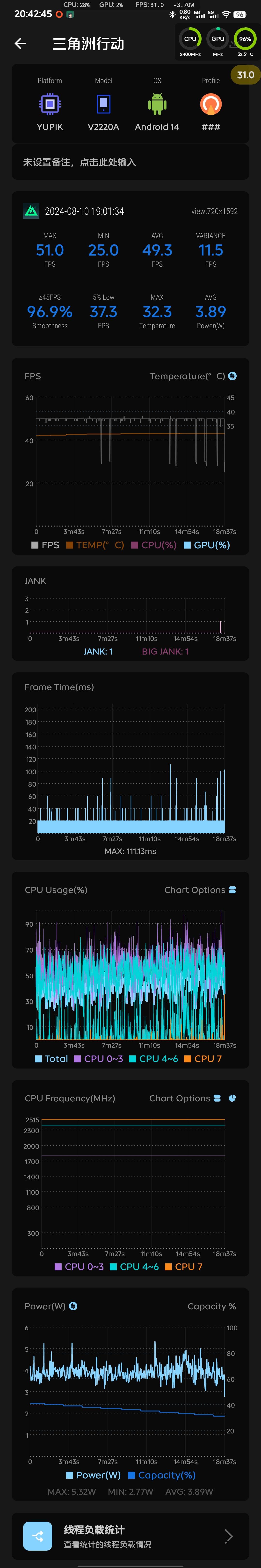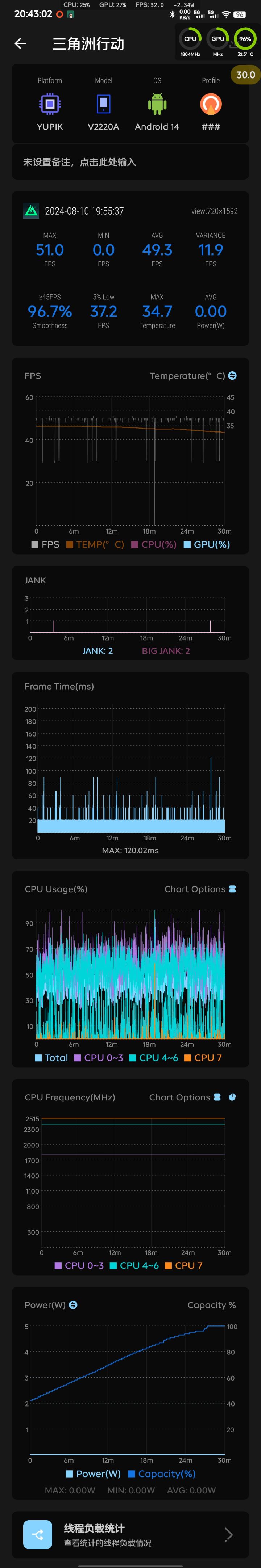 #三角洲行动 用scene测了三局全面战场,我是标准画质和极致帧率,我的SOC是骁龙778G+,是一颗三四年前的中端处理器了,在我把CPU八个核心的频率锁到最高的情况下,也就只能跑720P50帧,极限帧率在烽火地带都是六十帧,在全面战场就成50帧了,真的很不理解,我中小核一直都在跑,占用率平均在45%,GPU占用率也差不多,甚至大核动都不动一下这,说明还有很多很多的性能冗余,但是在帧率开最高的情况下也就只能开标准画质,而且分辨率还是720P50帧,就不能把画质放开一点吗,希望能够尽快弄一下,或者等开公测了把画质选项放开一点,分辨率都不要求要1080P,最起码要大于720P嘛,帧率和画质的选项也希望可以放开一点,我这颗三四年前的中端SOC都有这么多的性能冗余,我觉得最起码精致画质90帧是完全没问题的#三角洲行动双子测试