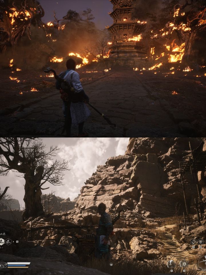 实际上,《黑神话》的战斗并没有大家想象的如此艰难。简单来说,本作的游戏难度对玩家操作的硬性需求并不算过高,只是要求玩家能够拥有一定程度的游戏熟练度,换言之,也就是最好能有一些动作游戏的基础,而游戏的第一章,便很好地起到了这个目标教学任务的作用。