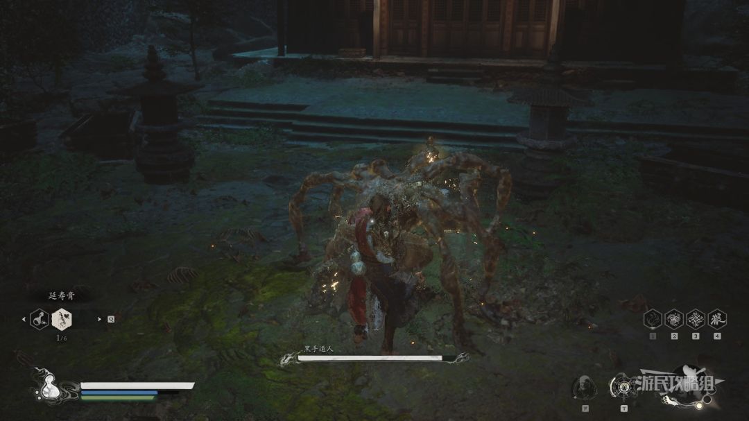 黑手道人施放戳地技能时会说固定台词:【谁的刀快谁就有理】和【白刀子进红刀子出】,在触发这两句台词并且看到他像下图这样两把武器都戳入地面,然后停住不动,背上的手臂像蜘蛛腿一样放在地上时,使用定身术,绕到黑手道人背后造成一定伤害,此时黑手道人的血条就会削减一小段,说明成功砍掉了他的手臂。