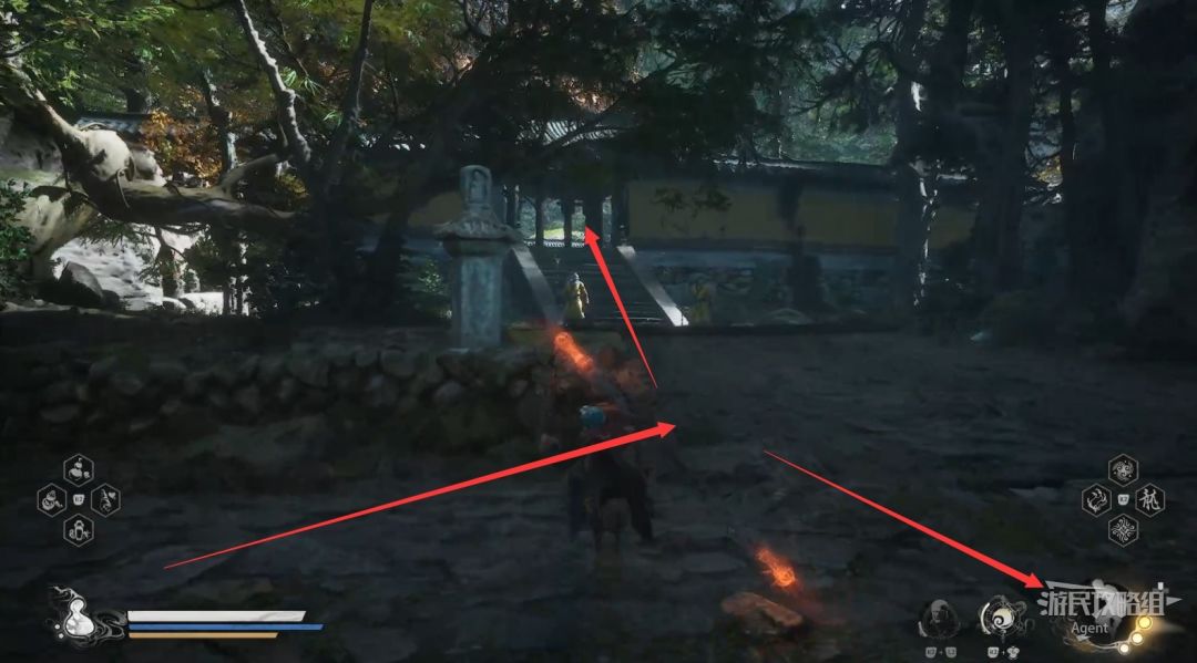 来到岔路口,左边通往“金光苑”土地庙和最终BOSS了,先去解锁土地庙,但是千万别再往前走了。