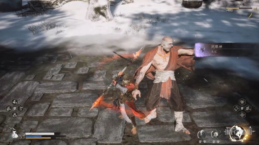 回到地图正中间的广场,往北走来到地图最北面的院子,先去右边打不净得到【精魄】不净,不净所在房间里还有个【打坐蒲团】。