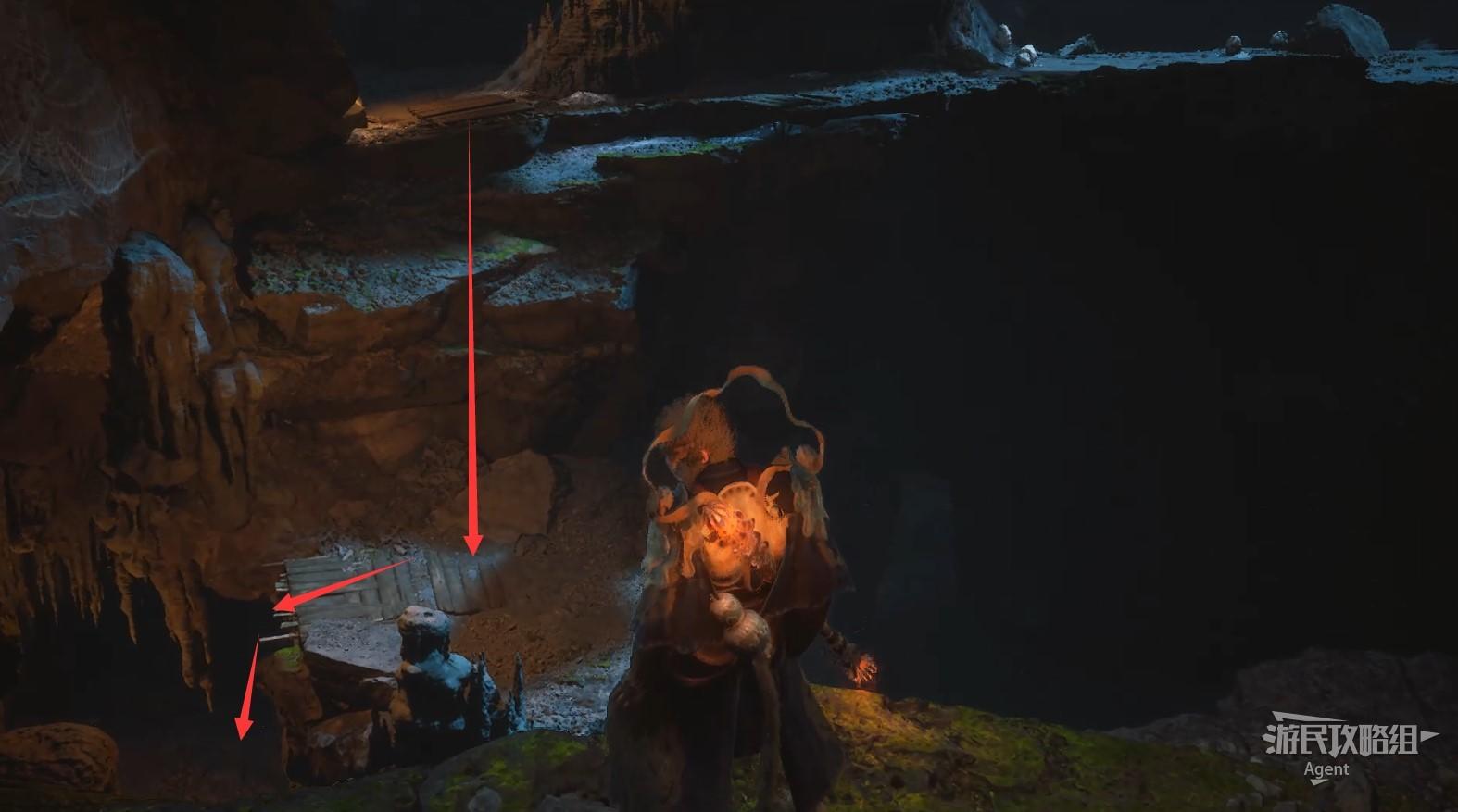 我们先从左边木板处跳下去,去探索一条比较长的隐藏路线(通往碎玉池)。等下再回来走大路往前深入探索盘丝洞。
