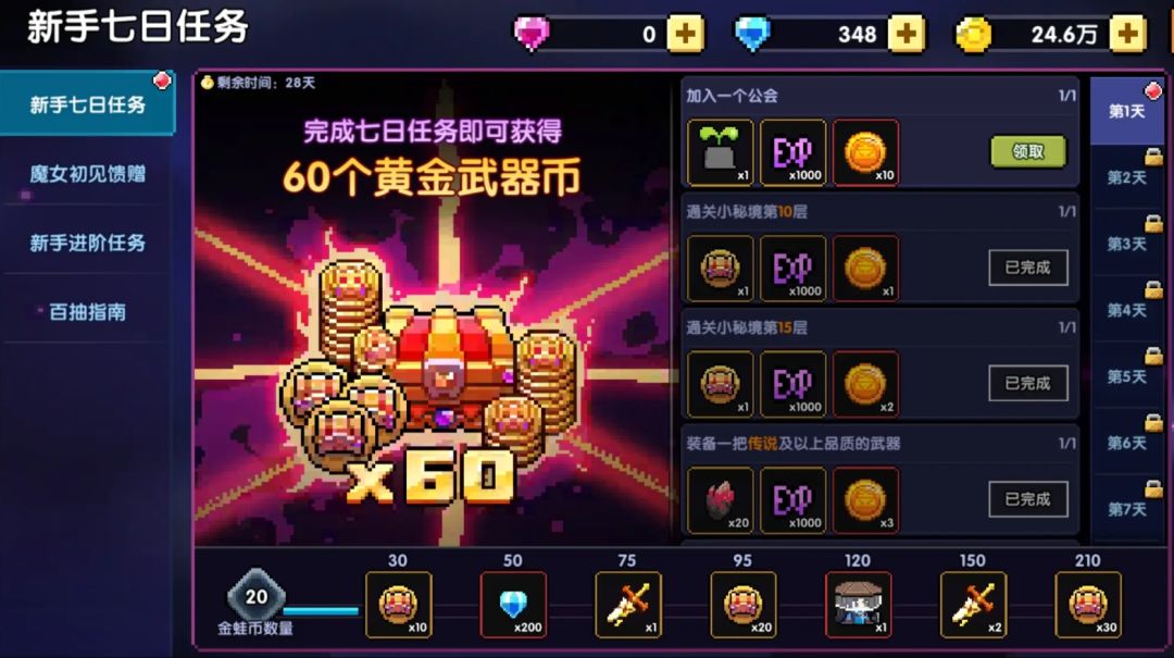 勇者通关小秘境8层后即可解锁新手100抽活动,完成相应任务可以领取共100抽黄金武器币,钻石,时装等奖励