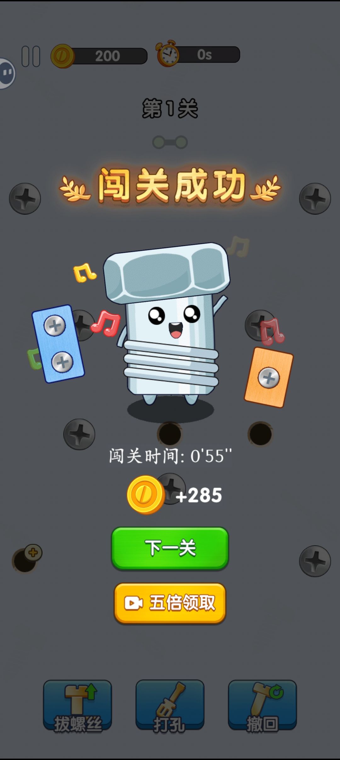 🌈闯关型玩法,游戏目标是拔掉所有螺丝钉,木板落下,需要注意螺丝钉拔下来只能放在孔里