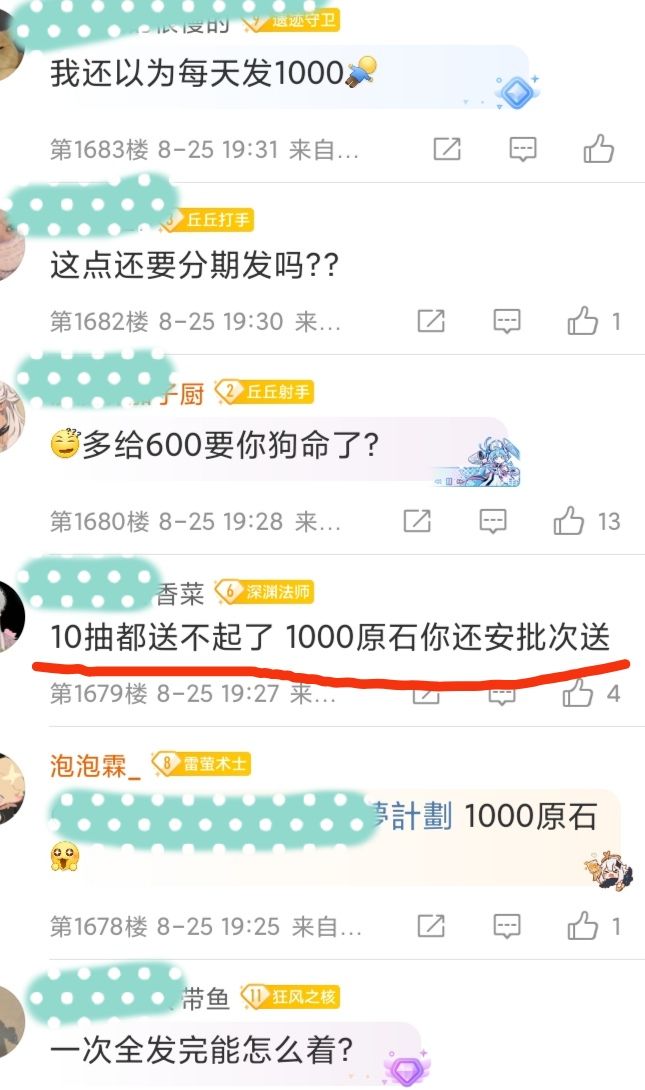 官方只发1000原石,还分5天发,不知道大家怎么看?