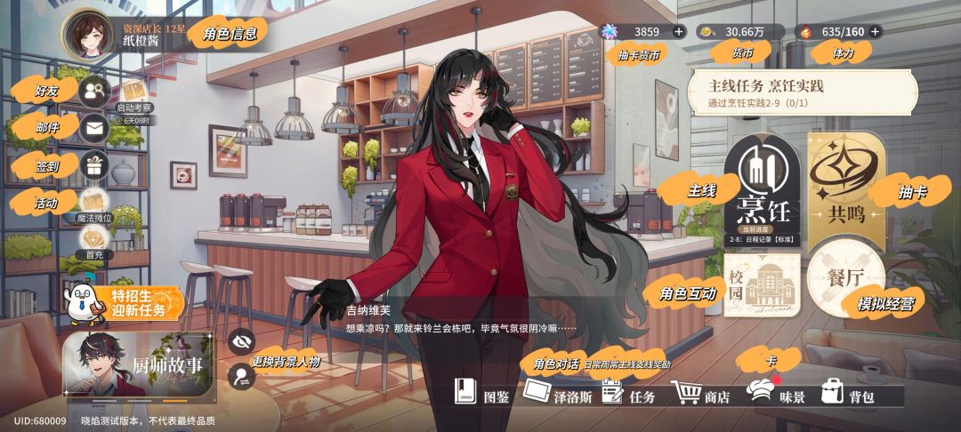 三测第二天。较二测而言,内容进一步丰富,玩法变得多样,制作者后劲十足呀!游戏定位副游,每天上线收餐厅的产出,买商店的打折商品(每日必购的一抽和每日采购),推主线、副本,做日常。主线围绕主角作为特招生到了一所顶尖厨师学校,学校里云集了各大派系的大师和传承人。剧情有些玛丽苏(特别是名字,尬笑),花了一些笔墨来描写菜品的制作过程和味道,文案是下了功夫的。可能有些过于专业了,对于我这种没做过饭的人来说有种虽看不懂但大受震撼的美。菜品描写大都非常繁复,很符合派系设定,但之后可以加一些玩家易在现实中操作的甜品饮品等,拉进与玩家的距离。