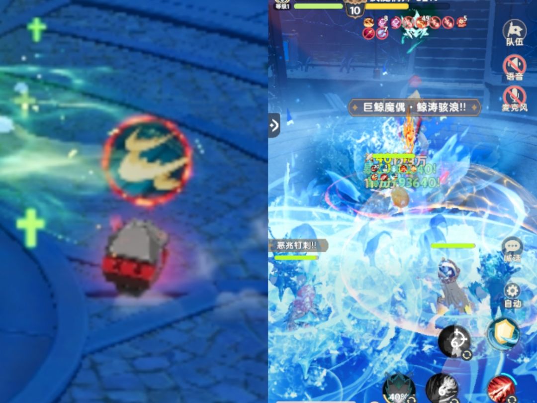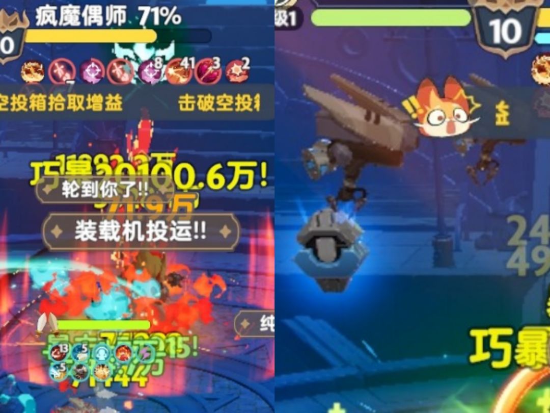 「Boss:疯魔偶师」吸收右侧红色空投箱,获得【技能:巨鲸魔偶 · 鲸涛骇浪】,对全体玩家造成多次伤害。