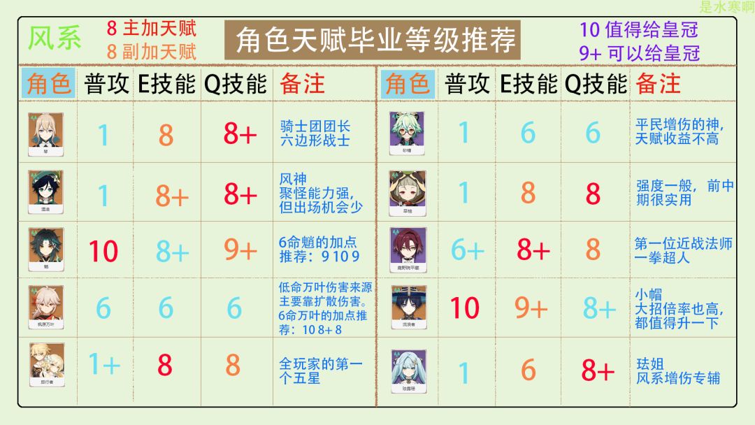 补充:图表中所有的天赋推荐等级,均未包括命座带来的等级加成。