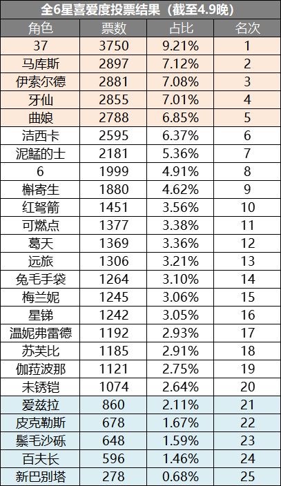 司辰们好呀!在上期喜爱度投票中,第一名是37拉第二名快1000票。本次投票将加入1.8-2.1版本的6星角色同时因角色过多而去除了开服的6星角色。在维拉、北方哨歌、露西、卡卡尼亚等角色的“压力”下,37还能否再获第一呢?