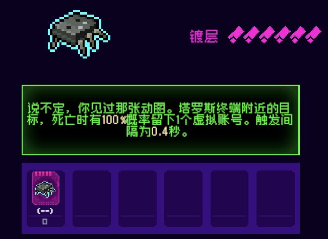 3.行走芯片:塔罗斯终端附近有怪死亡时,最高100%概率留下一个虚拟账号,触发间隔最低0.4秒
