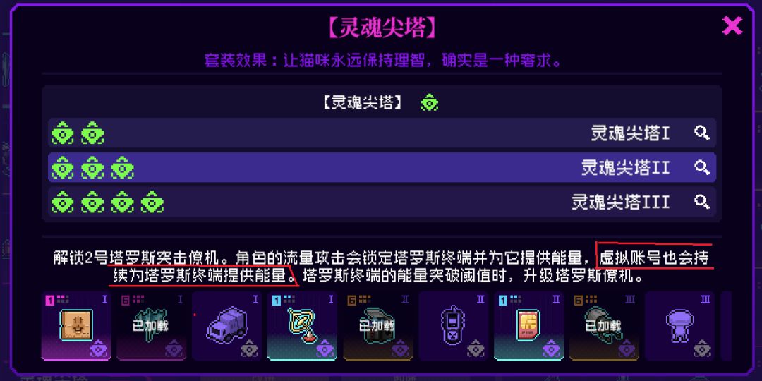 3.灵魂尖塔3件套效果,虚拟账号能给塔罗斯僚机提供能量,进行升级。