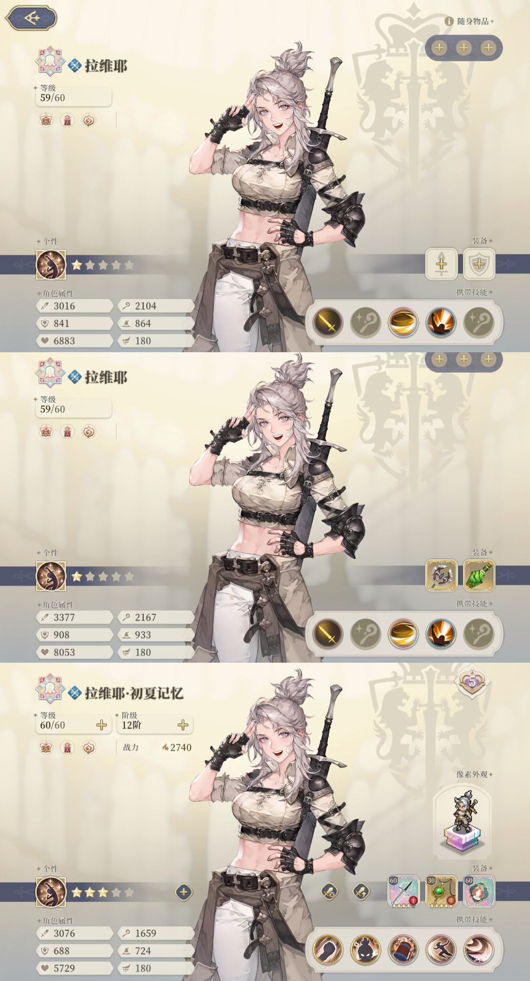 图 4 歌洛门内外练度对比,从上到下依次为门内裸装、门内全装、门外全装
