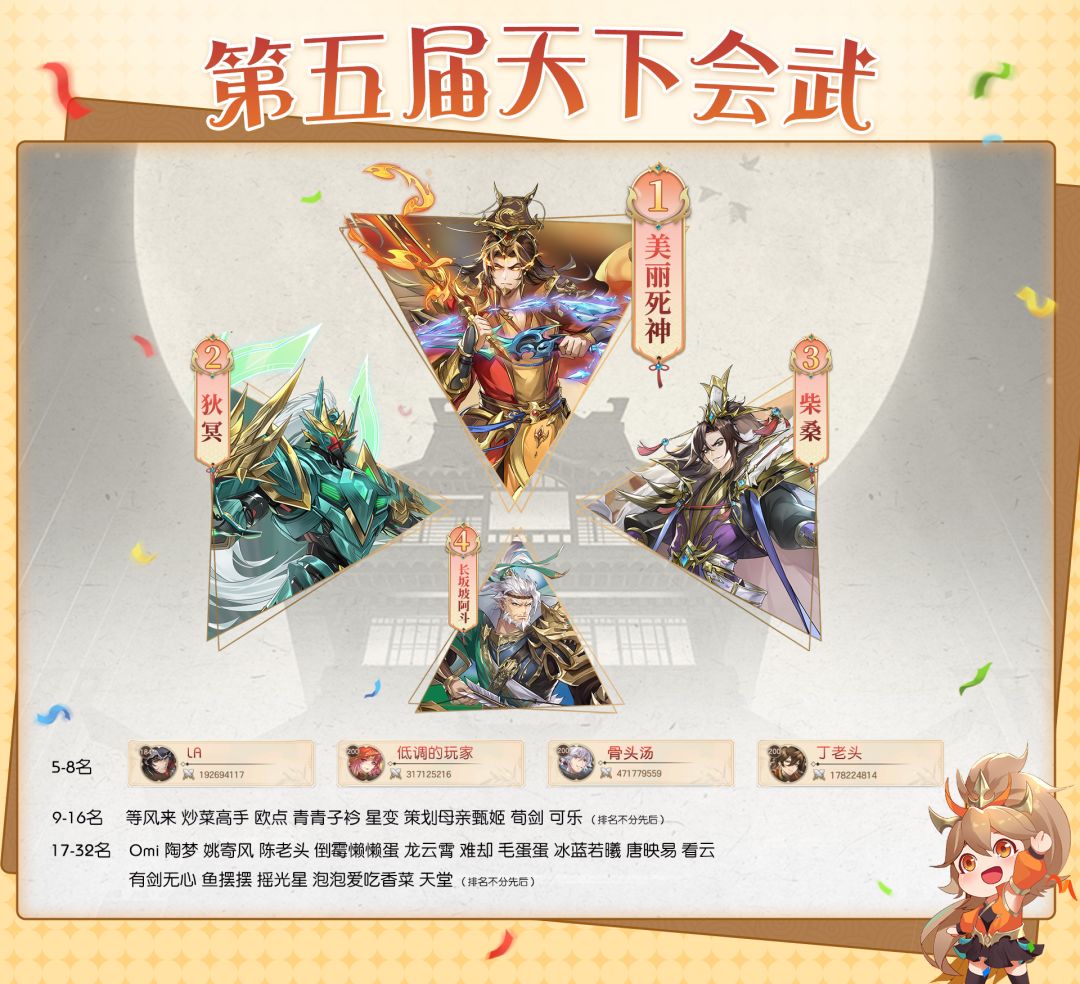 然后,依次由狄冥、柴桑、长坂坡阿斗分别夺得2-4名,都是老熟人了,4强常客。