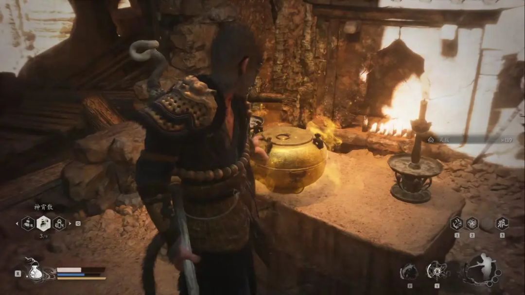 打完沙大郎后,我们回到上方平台,平台上可以看见一个小隧道,里面摆着一个绿色酒缸,从一旁进入打碎后我们可以获得三冬虫,可以陈年我们的椰子酒,从恢复三成三变成回复三成六。要回黑风山—翠竹林—白雾泽找老猴升级。