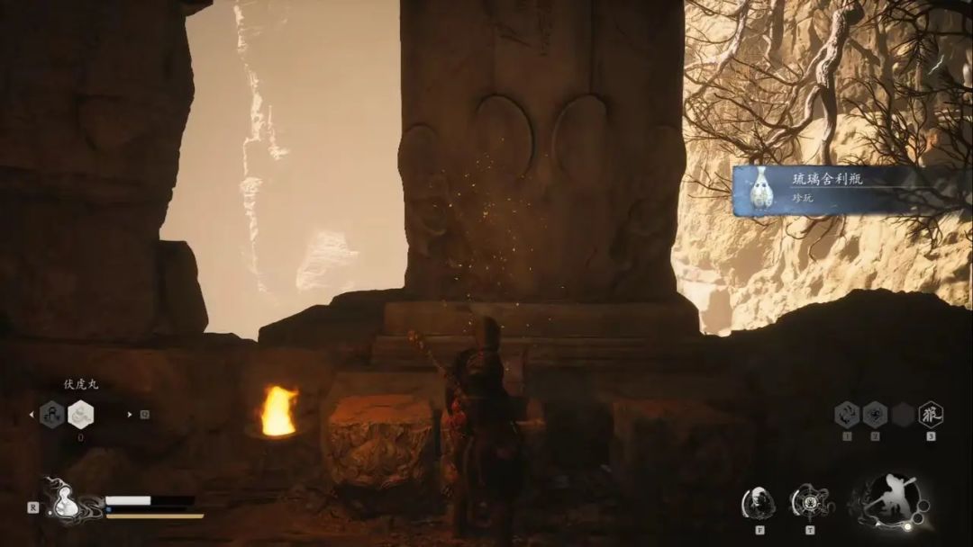 我们传送回卧虎寺,打开地牢,可以获得碧藕金丹,提升生命值上限。打败狸侍长获得其精魄,走到流沙前注意不要直接滑下去,我们滑到隧道前一半,按跳跃加重击二段跳(可以在跳之前多试试)到平台上拿到虎舍利。一路走滑过流沙,遇到那只黄鼠狼,我们可以在这里用玲珑内丹炼丹。