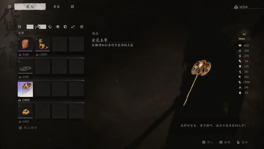 有石之精魄再次对话后他成为了一个贩卖物品的NPC需要我们下次来才会售卖,他售卖的醒酒石是获取定风珠的任务道具,卖六千属实太贵了,我不建议购买因为后面我们能免费获得一颗。金花玉萼能够增加10%的灵蕴获得,等等也就是说我们赚十二万八才能回本?这个就见仁见智了。泡酒物——铁蛋建议购买,词条简单暴力。金稳兽不建议购买,买12800卖6000,血亏。