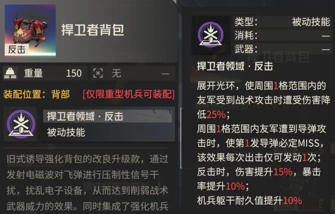 首先第一个彩色背包为“捍卫者背包”,这个背包大家注意仅限于重型机兵才能装备,且效果可以总结为: