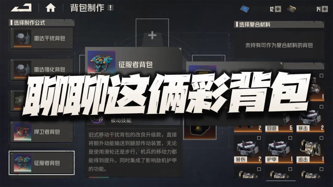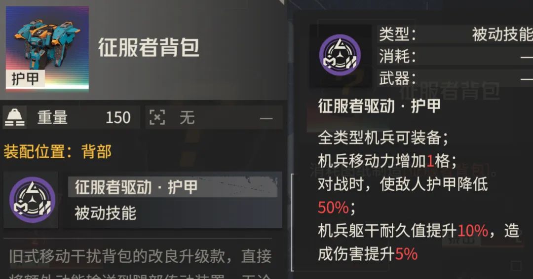接着第二个彩色背包是“征服者背包”,全系机兵都可以装备此背包,其核心能力可总结为: