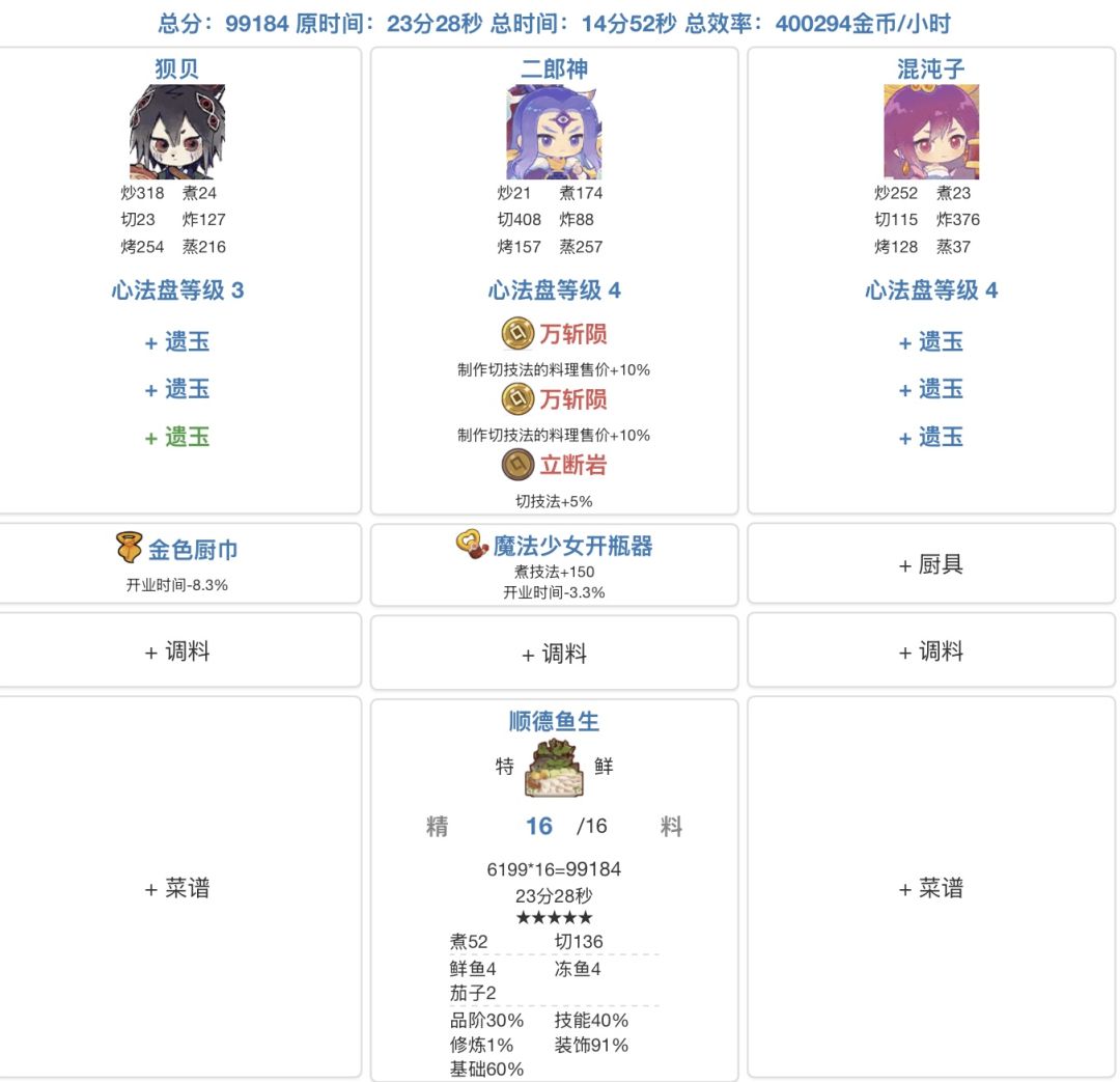 逛论坛发现售价光环厨可陪跑鱼生 从食材上来说确实不错 更追求效率就戴两个刺客 不过主厨可以跳过魔力橙直接换成二郎神了 不错不错 但仅过主线可用 平日里还是要省鱼