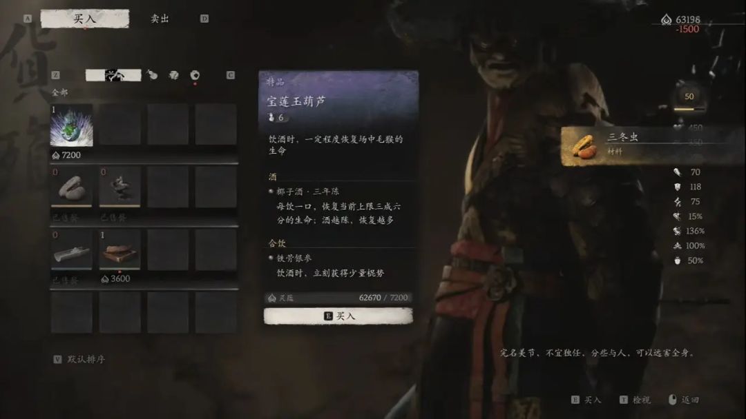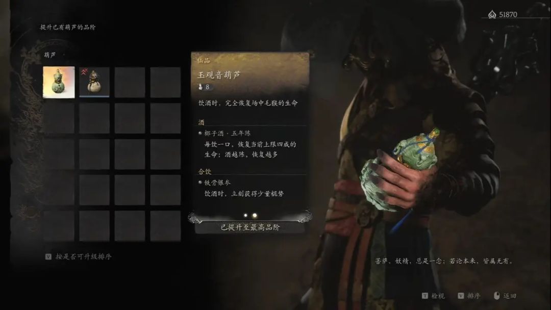 然后传送到黄风岭卧虎寺—地窖,找戌狗把我们收集到的玲珑内丹炼掉,同时还有一些新的丹药和物品可以买,大家自行购买,紧接着传送回黑风山翠竹林—白雾泽,找老猴升级,发现他这里可以买三冬虫和落伽香藤,甚至有一个新的酒壶宝莲玉葫芦,我们全部买下。把宝莲玉葫芦升阶后得到玉观音葫芦,再把椰子酒也升级。