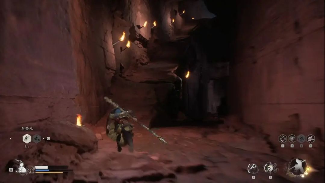 拿完东西后上楼梯,楼梯上有个拿弓箭的小怪,需要我们用棍花格挡一下。继续按照里外里的搜法,来到独木桥这里用聚形散气通过。一路走到这一层的尽头,能看到通往第三层的楼梯,第三层则是浮屠界—上层。