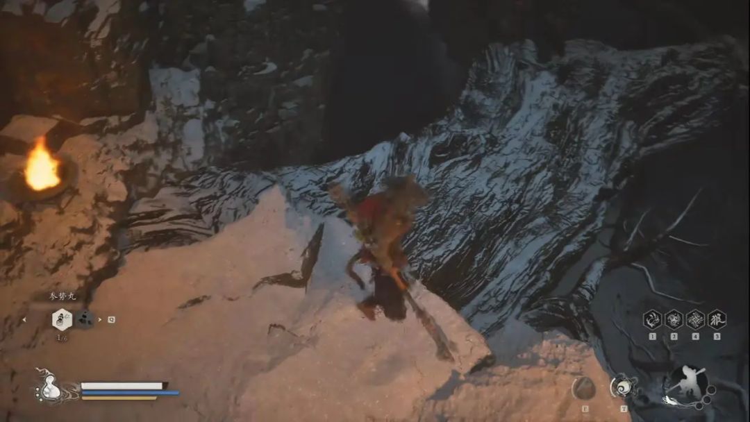 我们继续往右后方下山,不过这次我们不从湖边跳下去,而上沿着右侧往上走,能看到一个空地上跪绑着一个大和尚名叫不能,打完一阶段后表示之前让你两只手,现在不让你了再打一次,打完只会获得其精魄。打完后前方左侧悬崖边石塔下有个宝箱可以开,打完后我们传送回极乐谷—快活林。