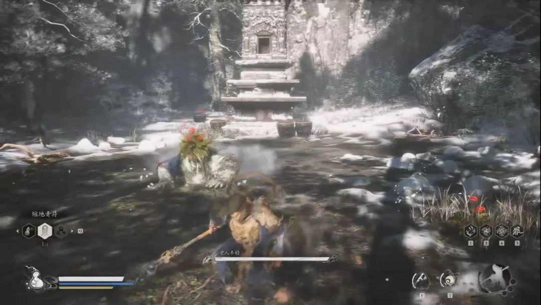 继续往前走,我们能听到一个人一直在那喊冷,他位于道路左侧树下,我们用安身法画一个火圈让他进去取暖后,与他对话完,一定要对话完,黑神话所有任务你不对话完都不会解锁到下一步,我继续往前走能看到土地庙,极乐谷—罪业塔林。点燃土地庙后,我们继续向前行走,看到一地的人参,拔出中间那颗就会遇到老人参精,击败后获得衣甲—山珍蓑衣,千年人参种子、酒食—铁骨银参和其精魄。继续往前走到石塔后边有一壶酒—琼浆,喝了能恢复法力。