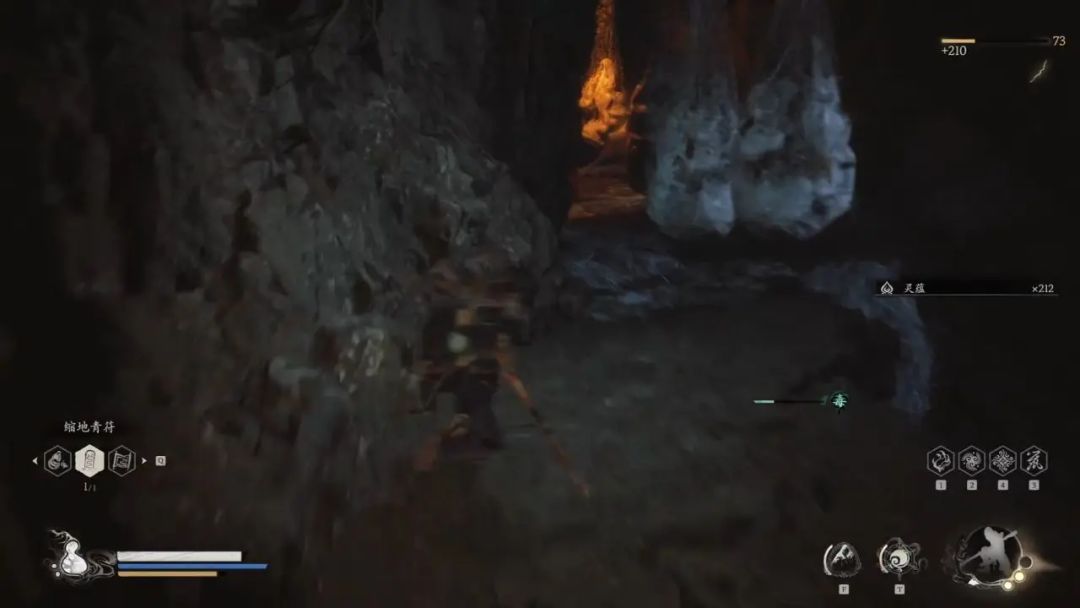 我们沿着右侧墙壁走,清理完蜘蛛卵能发现右侧有一个洞穴,洞穴里面是宝箱。这个蜘蛛洞看着弯弯绕绕事实上就一条路,我们只要沿着墙壁走就能很快走出去。我们上山的路上有一只蝎太子(1/4),我们需要击杀四只和BOSS才能解锁一个成就。