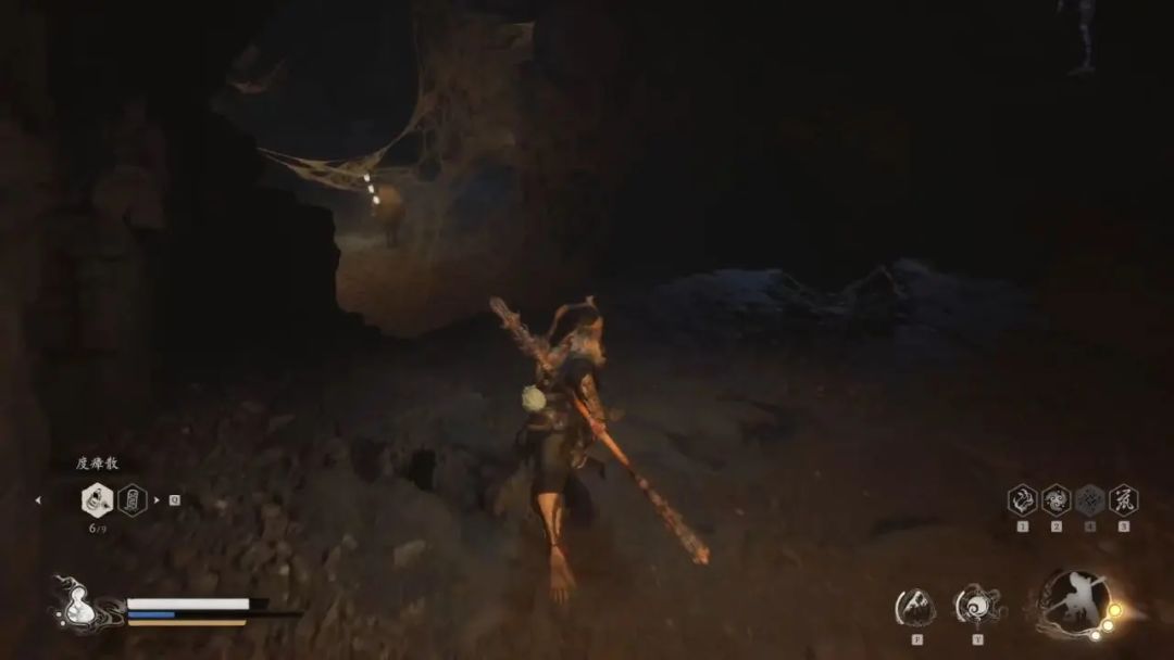 我们拿完宝箱爬上去,走上面的路不要在下去了,往有火光的地方走,会进入一个有很多小蜘蛛的隧道。继续往前面走是盘丝洞—底层土地庙,我们的右侧有一个缝隙可以进去,进去之后是一个蒲团—底层洞天深处(3/6),我们先点燃土地庙,然后去打坐。