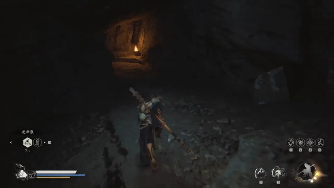 打坐完往回走发现一个洞口有火盆的隧道,我们进隧道,注意不要在边缘掉下去,走到尽头,我们能看到下边有个火盆,跳下去往前面走,能遇到波里个波,击败后获得材料—小活师、佛手·左。