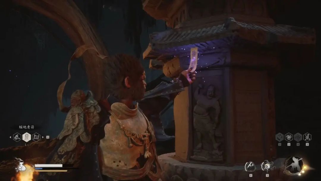 书接上回,我们拿完仙酿后,出来能看见一棵大树,右边那条路过去会遇到我们的四妹想要摘除石塔上的符咒,我们帮助她把符咒摘下来,四妹的隐藏任务我们就完成了(1/4),摘完符咒后我们返回到大树这选择往左边道路走。