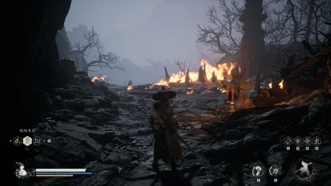 我们和二师兄从盘丝岭出来后,与二师兄一路横冲直撞来到了火焰山,和二师兄解决了一群虾兵蟹将后,我们推开大门,点亮火焰山—灰烬林—火燎一关土地庙,此时我们面前有两条路,左边路的尽头是一团灵蕴,右边是我们的主路。