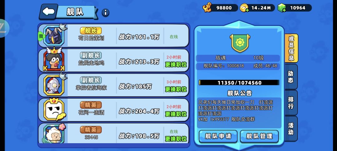 大家好!我们是十级战队“战魂”,舰队目前稳定开1w5箱子,从舰队系统开放第一天我们就成立了!我们舰队有很多队长也是从那一天开始加入并一路成长过来的,希望有更多的小伙伴加入我们,一起成长!